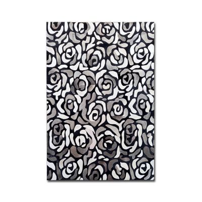 This hair-on-hide 8′ x 10′ rug features a pattern of abstract roses done in black, white, and grey. The repetition of the shapes gives the rug dimension while the color scheme complements so many of our collections.