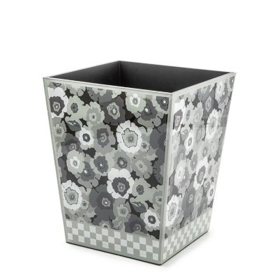 Make the powder room or any other space pretty with this waste bin, featuring a pattern of grey florals and checks printed on glass, finished with beveled edges.