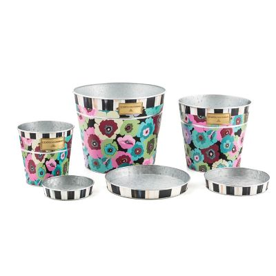 Put your prettiest posies on display with this set of three galvanized metal pots of varying sizes and accompanying saucers, decorated with a festive floral pattern and Courtly Stripe and finished with the MC nameplate.