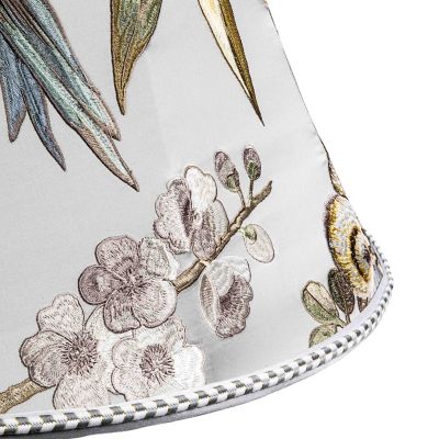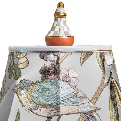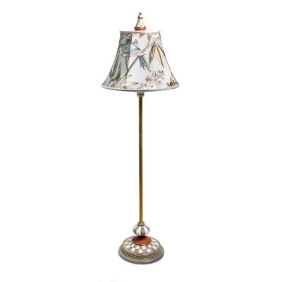 From its bold ceramic base to its sculpted finial, the Sterling Check® Atelier Floor Lamp enlightens every room. Handmade and hand-painted in Aurora, New York, it’s topped with a spectacular shade, featuring embroidered bluebirds on grey fabric. Tasseled pulls turn the lamp on and off.