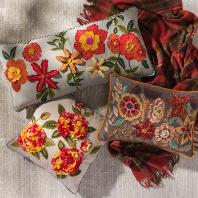 Our Autumn Lilies & Poppy Lumbar Pillow is a dimensional delight. Harvest-hued blossoms detailed with embroidery and beading virtually leap off the linen surface, accented with embroidered leaves and stems. It’s trimmed with black and white checked piping.
