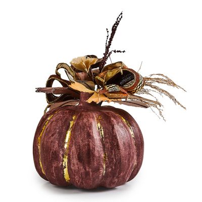 Add a bit of autumn elegance to tabletops and mantels with this short paper mache pumpkin that’s trimmed with everlasting leaves, seedpods, pinecones, and paper anemones and finished with gold leaf and Courtly Check® sinamay ribbon.
