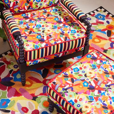 Why trade durability for fashion? The 2’3″ x 3’9″ Avant Garden Indoor/Outdoor Rug offers both. Made of hand-tufted polyester, it features colorful blooms with a striped black and white border. It can be used indoors or outdoors in a shaded or covered area with limited direct exposure to sunlight. It’s the perfect complement to our collection of Avant Garden Outdoor Furniture.