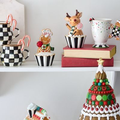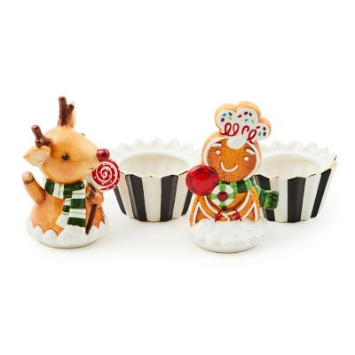 Bake holiday spirits bright with this set of two hand-painted ceramic cupcake boxes. Featuring a gingerbread man and a deer, they’re trimmed with gold lustre. The tops lift to store treats inside.