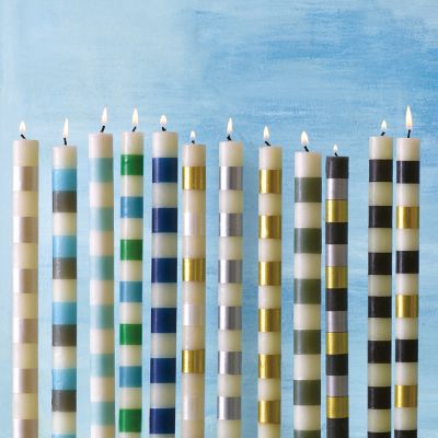 Turn your everyday meals into something more memorable with our Gold Bands Dinner Candles. They feature a fun and fresh hand-painted pattern of horizontal stripes that add the glowing touch of MacKenzie-Childs to your dining table. This set of two beeswax-blend candles will cast a lovely lustre on your table for up to 10 hours.
