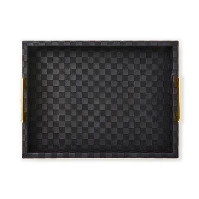 Make serving stylish with this small tray featuring an embossed faux leather check surface. Shiny gold handles add to the ease of carrying it wherever it’s needed—indoors or out.