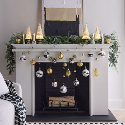 Make the tree merry with this jumbo glass ball ornament, featuring black and white checks and a crown finial.