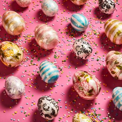 Our set of four Black & White Floral Scroll Eggs make a statement for spring. Made of capiz hand-painted with leaf and scroll patterns, they’re presented in a mesh crate, topped with a raffia bow. Display them on their own or with our other capiz eggs.