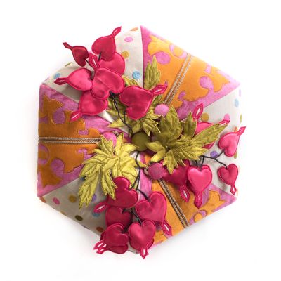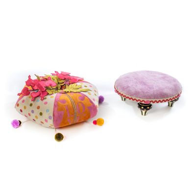 Pop goes the pink on our Bleeding Hearts Footstool. Bursting with patterns, this playful piece mixes alternating appliqued velvet panels featuring the word LOVE with dots embroidered on raw silk. Topping it all off is an explosion of wired fabric hearts and leaves that can be molded into various arrangements, allowing you to customize its look again and again. Oversized rickrack trim and swinging pom-pom tassels add even more to a conversation piece that’s sure to have everyone talking.