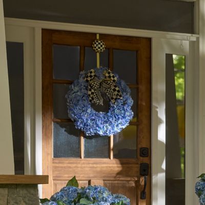Extend a warm welcome with this everlasting blue hydrangea wreath that’s trimmed with a mix of Courtly Check® ribbon and crowned with a Courtly Stripe button.