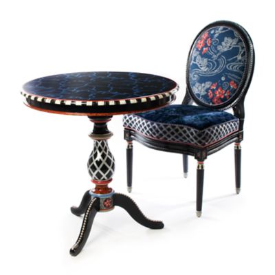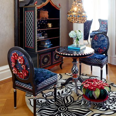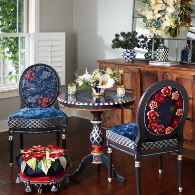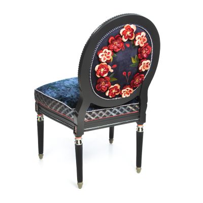 Made of masterfully carved European beechwood and hand-painted in Aurora, New York, our Bluetopia Side Chair bathes you in blue bliss. Enhancing the frame’s elegance is a mix of blue fabrics, crowned with a floral print featuring plum blossoms that was inspired by a Japanese kimono. And be sure to note the back of the chair, which features those same plum blossoms done in lifelike detail and dimension. The finishing touch is blue harlequin stitched cording around the chair back and seat cushion. All in all, it’s a rhapsody in blue.
