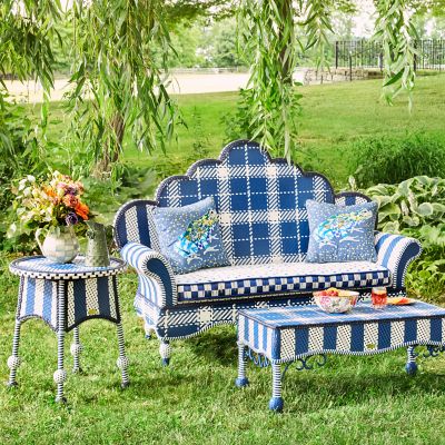 Take wicker up a notch with our Boathouse Outdoor Coffee Table, a versatile piece that’s perfect for parking a summer drink. It’s fashioned in a brightly bold geometric plaid and stripe pattern done in royal blue, navy blue, and white that’s wrapped on a PVC frame.