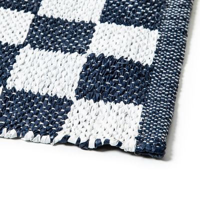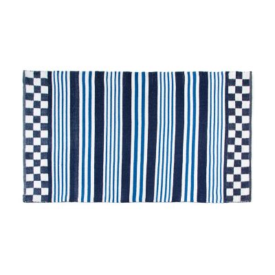 Take a deep dive into blue with our 5′ x 8′ Boathouse Outdoor Striped Rug. Crafted of woven vinyl, it features blue stripes with check borders. Durable and water-resistant, it can be used indoors or outdoors in a shaded or covered area with limited direct exposure to sunlight. It’s the perfect complement to our Boathouse Outdoor Furniture collection.