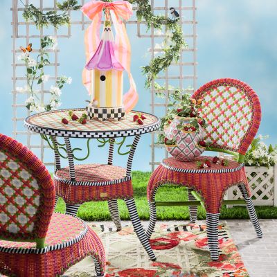 Take wicker up a notch with our Breezy Poppy Outdoor Cafe Chair, a versatile piece that’s perfectly proportioned for our Breezy Poppy Outdoor Cafe Table. It’s fashioned in a brightly bold geometric pattern of pink, white, chartreuse, and salmon resin wicker that’s wrapped on a PVC frame.