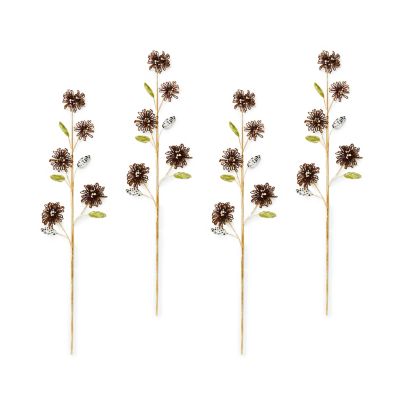 Add a bit of autumn elegance to wreaths and arrangements with this set of four beaded flower spray stems. Each features brown bugle bead flowers with rhinestone centers, trimmed with beaded leaves in black, white, and green.