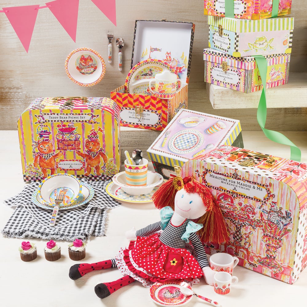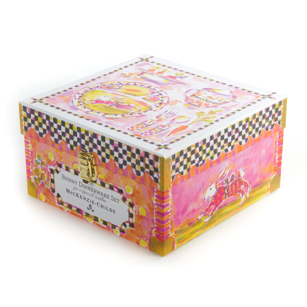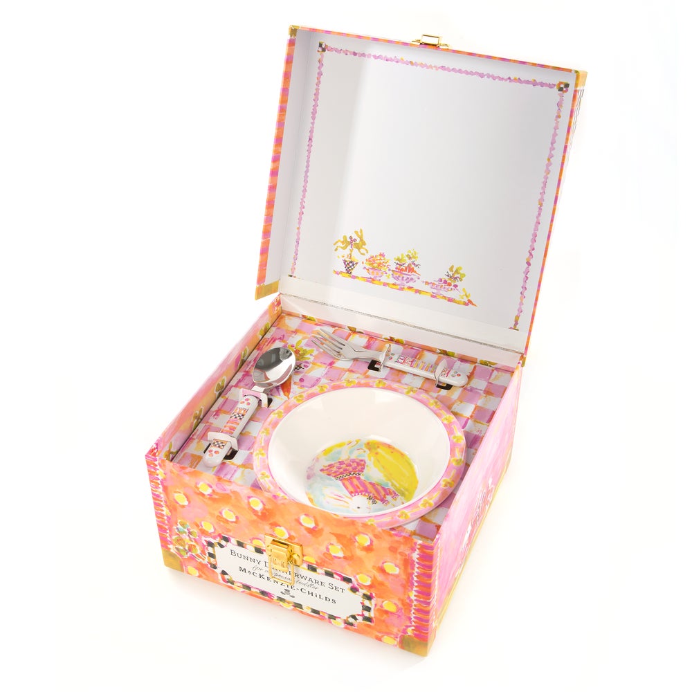 Make mealtime fun with our happy designs. Each Bunny Toddler’s Dinnerware Set includes a BPA-free melamine sectional plate, bowl, and two-handled sippy cup, plus a fork and spoon, all nestled in an extra-special matching gift box with latch closure. A fun gift for baby.