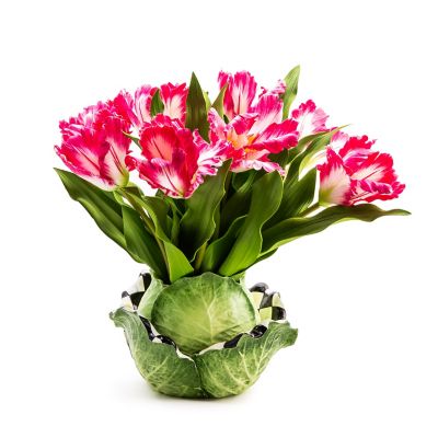Our Cabbage Arrangement is absolutely farm-fresh, with everlasting pink parrot tulips set in a hand-painted cabbage-like bowl that has our signature pattern inside the leaves.