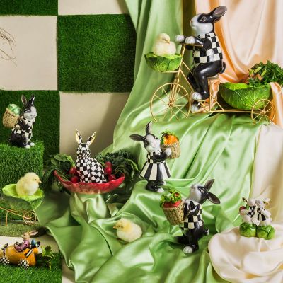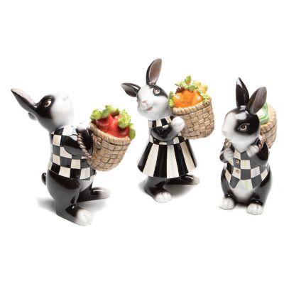 Our set of three Cabbage Garden Bunnies are ready to celebrate spring. Decorated with hand-painted Courtly Check® and Courtly Stripe, each bunny holds a different vegetable—beets, carrots, and cabbage—in its basket.