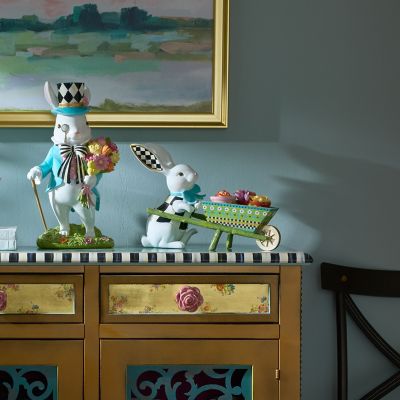 Stroll into spring with this tabletop bunny with wheelbarrow. The bunny, which is hand-painted and accented with Courtly patterns, pushes a cart filled with three small pots of florals.