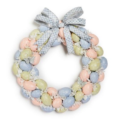 Welcome spring with this wreath decorated with faux decorated eggs in pale shades of green, peach, and blue, and trimmed with small Sterling Check® butterflies and a Sterling Check bow.