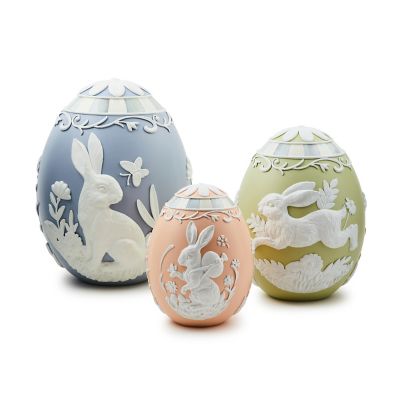 Make spring egg-ceptional with this large pale blue egg featuring a standing rabbit that’s decorated with Wedgwood-inspired detailing and trimmed with Sterling Check®.