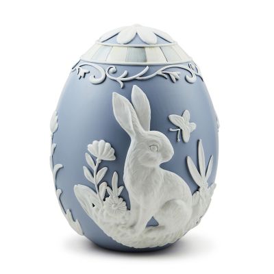 Make spring egg-ceptional with this large pale blue egg featuring a standing rabbit that’s decorated with Wedgwood-inspired detailing and trimmed with Sterling Check®.