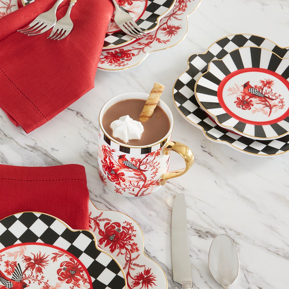 Top the table with this ceramic mug that’s decorated with a red cardinal and floral toile pattern, edged with black and white stripes, and trimmed with a gold lustre handle.