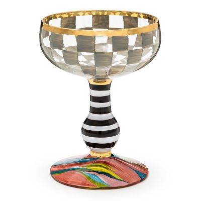 Make any occasion more special by setting the table with this hand-painted mouth-blown coupe glass. Featuring grey checks atop a striped stem set on a playful marbled base, it’s trimmed with gold lustre.