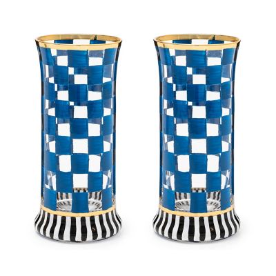 Make any occasion more special by setting the table with this set of two hand-painted, mouth-blown highball glasses. Featuring royal blue checks on a striped base, they’re trimmed with gold lustre.