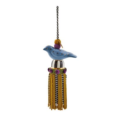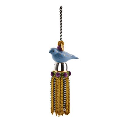 This bird tassel is done in cerulean-colored, hand-painted ceramic with passementerie tassels and trims. Decorate doorknobs, finials, or curtains, or use it as a high-flying ceiling fan pull.