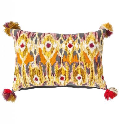 Add a touch of texture with this pillow, detailed with a machine-embroidered mosaic pattern, and trimmed with tassels on the corners.