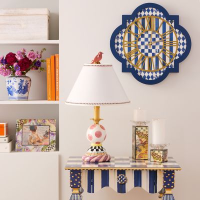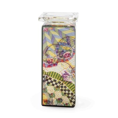 This tall candle holder is decorated with transfers of our legacy napkin patterns printed on gold foil under the glass surface. A glass tray on top holds a 4-inch pillar candle or a standard dinner candle.