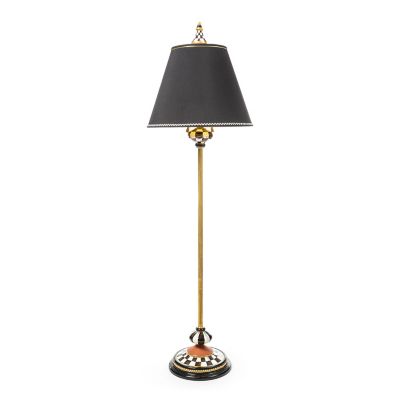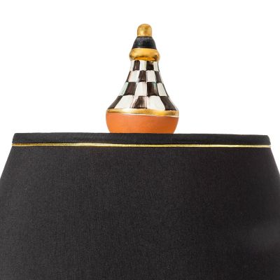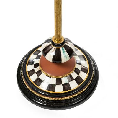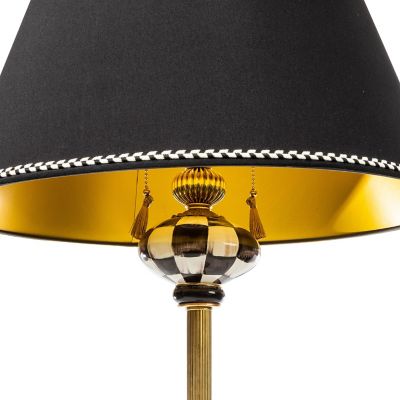 From its bold ceramic base to its sculpted finial, the Courtly Check® Atelier Floor Lamp enlightens every room. Handmade and hand-painted in Aurora, New York, it’s topped with a black hardback shade with a gold interior, embellished with black and white braided soutache.