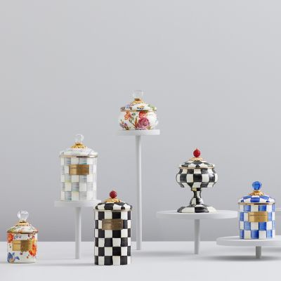 For housing treasured trinkets, there’s no container more charming than our Courtly Check® Enamel Curiosity Pot. A handsome curved pot with a perfectly matched pedestal is dressed in our signature checks and topped off with a lid featuring a brass bobeche and carved crimson bead finial.