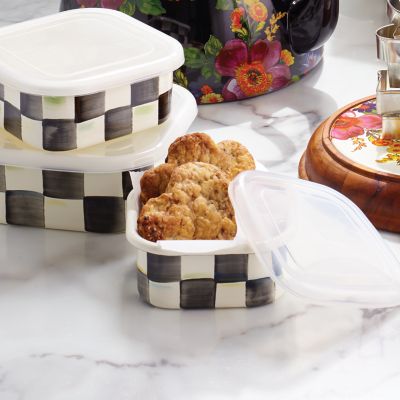 Square storage in ever-so-handy sizes, with BPA-free plastic lids to keep what’s inside fresh. (Did someone say “cookies”?) The steel underbody of our Small Courtly Check® Enamel Squarage Bowl is hand-painted with color-dragged checks and rimmed in bronzed stainless steel. Please note: Bowl and lid are not microwaveable.