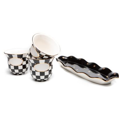 The hand-painted ceramic Courtly Check® Herb Garden Set includes three checked flower pots displayed on a tray trimmed with dots and gold lustre. You can label what is growing in each pot with an erasable marker, making this both pretty and practical.