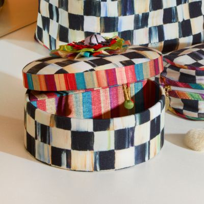 Our Courtly Check® Round Jewelry Box offers practical yet beautiful decorative storage. With such stylish organization, you might find yourself leaving the closet doors open! Printed with our signature Courtly Check® pattern on linen-blend fabric, and accented with a multicolored, beaded rosette and bright stripes.
