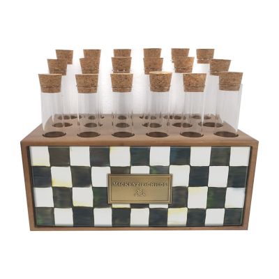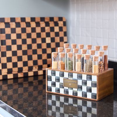 Spice things up with the Courtly Check® Spice Rack. The wood base, decorated with a hand-painted enamel Courtly Check plate, holds 18 glass vials with two extra replacement vials. Use them to hold spices in the kitchen, glitter in the craft room or delicate floral stems anywhere.
