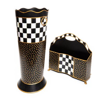 When it rains, it pours—and with the Courtly Check® Umbrella Stand, we can’t help but celebrate the showers! This toleware collection updates a classic craft with a MacKenzie-Childs twist: hand-painted Courtly Checks and jazzy golden polka dots that go beyond basic black and white. This handsome metal container is the perfect place to park your parasols.