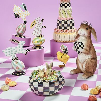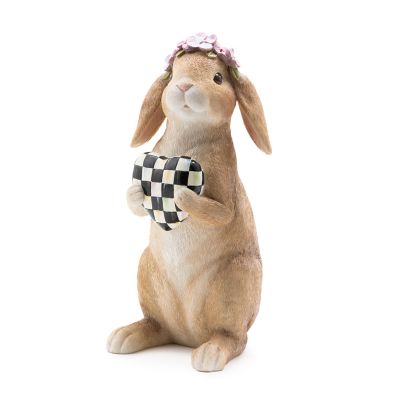 The Courtly Cottage Rabbit hops onto your tabletops, adding a touch of adorable. This hand-painted resin rabbit, wearing a crown of hydrangeas, holds a heart of our signature pattern.