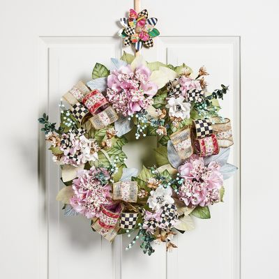The Courtly Cottage Wreath is truly in full bloom. Featuring everlasting pastel florals with touches of Courtly Check on a backdrop of leaves and natural branches, it’s embellished with Courtly Check® and Courtly Check Sinamay Ribbon. Hang this in a protected location.