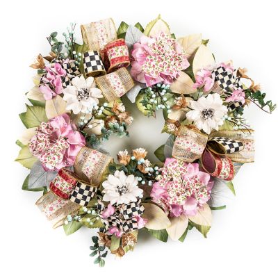 The Courtly Cottage Wreath is truly in full bloom. Featuring everlasting pastel florals with touches of Courtly Check on a backdrop of leaves and natural branches, it’s embellished with Courtly Check® and Courtly Check Sinamay Ribbon. Hang this in a protected location.