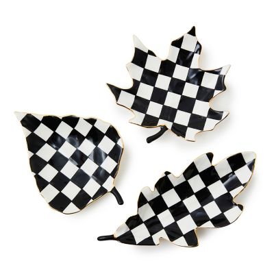 Bring the outdoors indoors with a dash of MacKenzie-Childs with this set of three leaf-shaped ceramic trays, featuring black and white checks and trimmed with gold lustre.