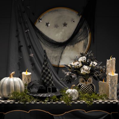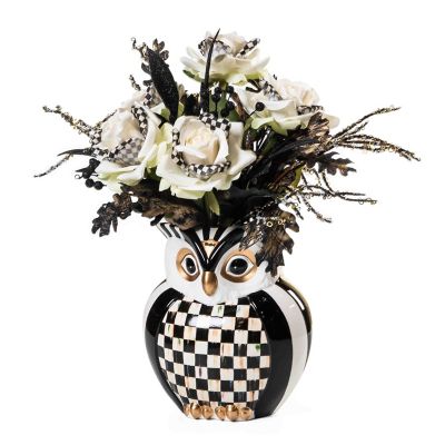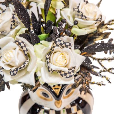 Set the scene for Halloween with this everlasting arrangement of black florals and feathers, accented with Courtly Check® ivory roses, and set in a hand-painted Courtly ceramic owl planter.