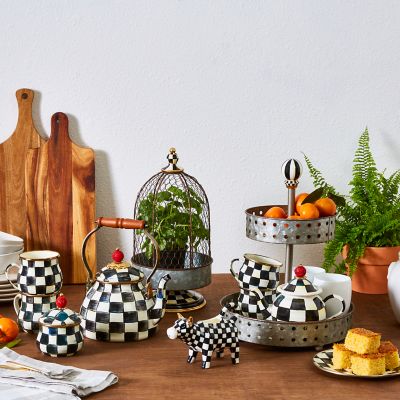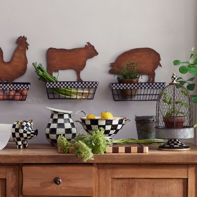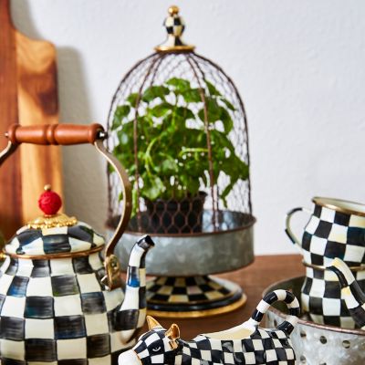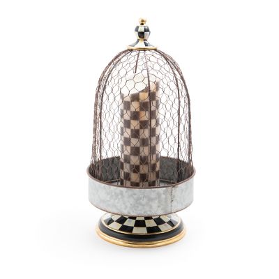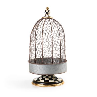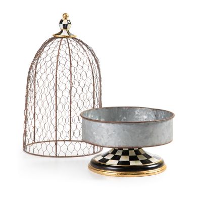 The Courtly Tin Cloche is the perfect pedestal to highlight something fresh and fun. The chicken wire cloche, finished with a Courtly Check® finial, fits onto a resin base with a galvanized metal dish on top.