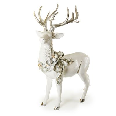 Primp your holiday porch or entry with this weather-resistant standing trophy deer. It’s dressed to impress in wintry white with silver leaf hooves and antlers, wearing a collar of ornaments finished with a Sterling Check® bow.