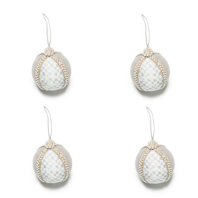 Make the tree a winter wonderland with this set of four ball ornaments, featuring panels of Sterling Check® and faux grey suede and finished with bugle bead trim.