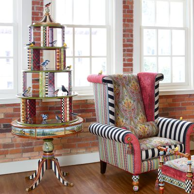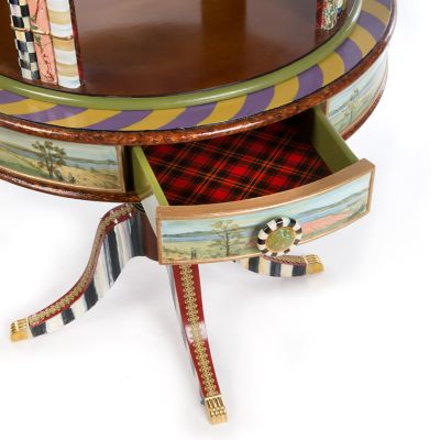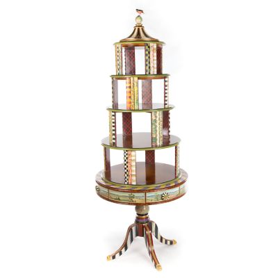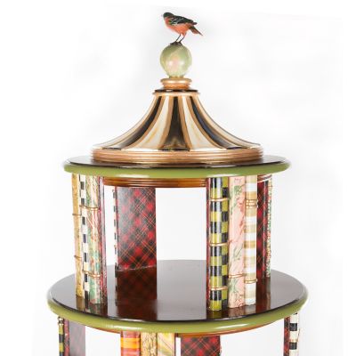 For collectors, compilers, and connoisseurs, there’s no greater way to showcase beloved curios than our Curiosity Carousel. A spectacular four-level stage, it features hand-painted pastoral farm scenes, faux tortoiseshell, Courtly Checks®, multihued stripes, and trimmings of Scottish tartan, gold lustre, and faux marble. Perched atop it all, a pretty little bird surveys the scene. Spectacular for exhibiting favorite souvenirs, books, and favorite framed photos—not to mention, a stunning tribute to the craftsmanship of our master artisans.