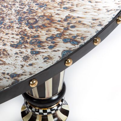 Our Dotography collection of furniture takes the classic simplicity of black and white way beyond basic with glamorous details that provide texture and interest. The Dotography Coffee Table, with an iron frame with brass components, reflects your good taste with a mirrored top featuring the finish of antiqued mercury glass. Ceramic legs, hand-painted by our artisans in Aurora, New York, add to the one-of-a-kind look.