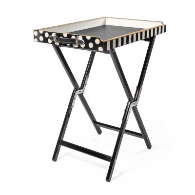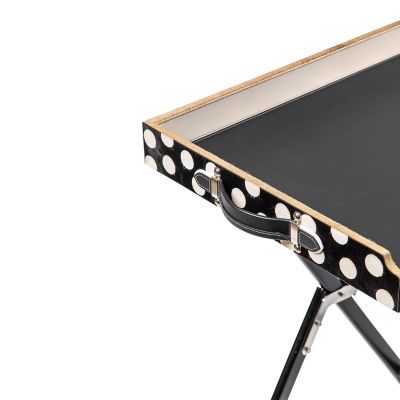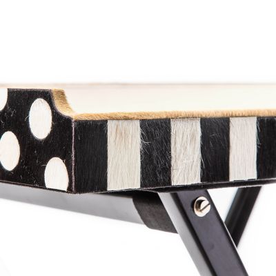 This vividly versatile piece is ready to serve in so many ways, from accent table to bar stand. The tray top is trimmed on the top and sides with hair on hide and features leather handles with nickel-finish hardware. It removes from its collapsible base.